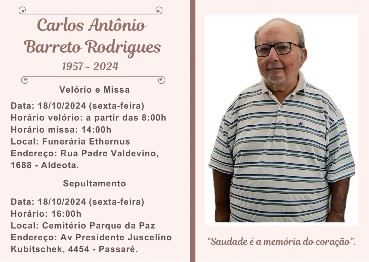 É com profundo pesar que lamentamos o falecimento de Carlos Antônio Barreto Rodrigues, aos 67 anos, apaixonado torcedor do Ferroviário Atlético Clube, fruto de uma grandiosa família de corais e professor da Universidade Federal do Ceará.