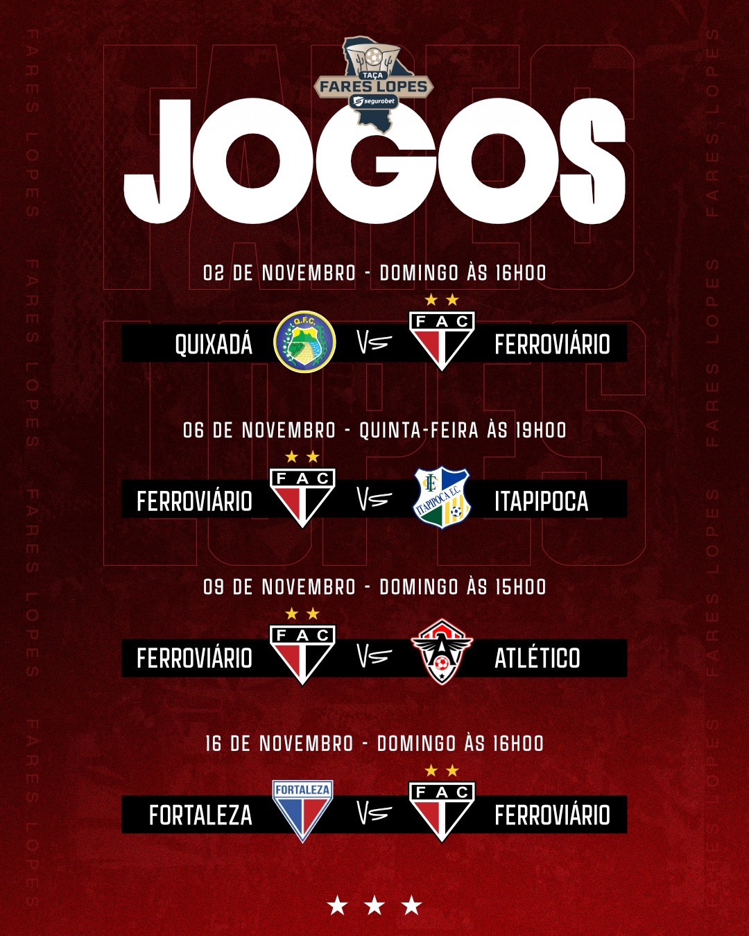 A Diretoria de Competições da Federação Cearense de Futebol (FCF) divulgou a tabela detalhada dos compromissos do Ferroviário na próxima edição da Taça Fares Lopes. A competição tem seu início previsto para o dia 25 de outubro. Enquanto a estreia coral, fora de casa, está programada para o dia 2 de novembro, às 16 horas, no Estádio Abilhão, diante do Quixadá.